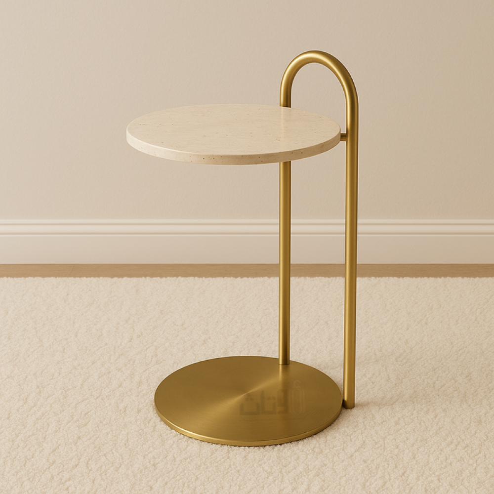 طاولة جانبية بتصميم عصري سطح ترافنتين وقاعدة استيل ذهبي أنيق
