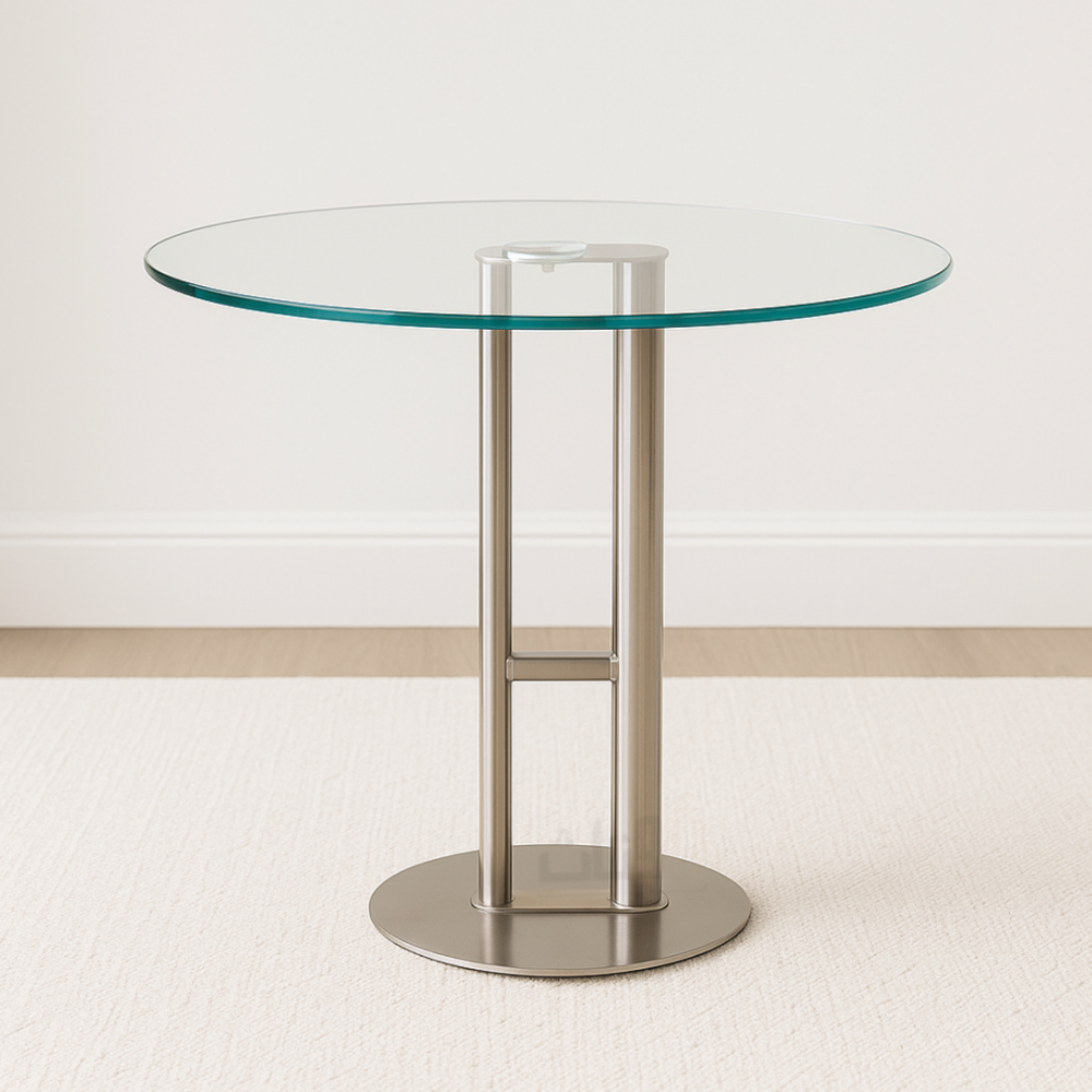 طاولة جانبية مستديرة بسطح زجاجي وقاعدة استيل فضي تصميم عصري