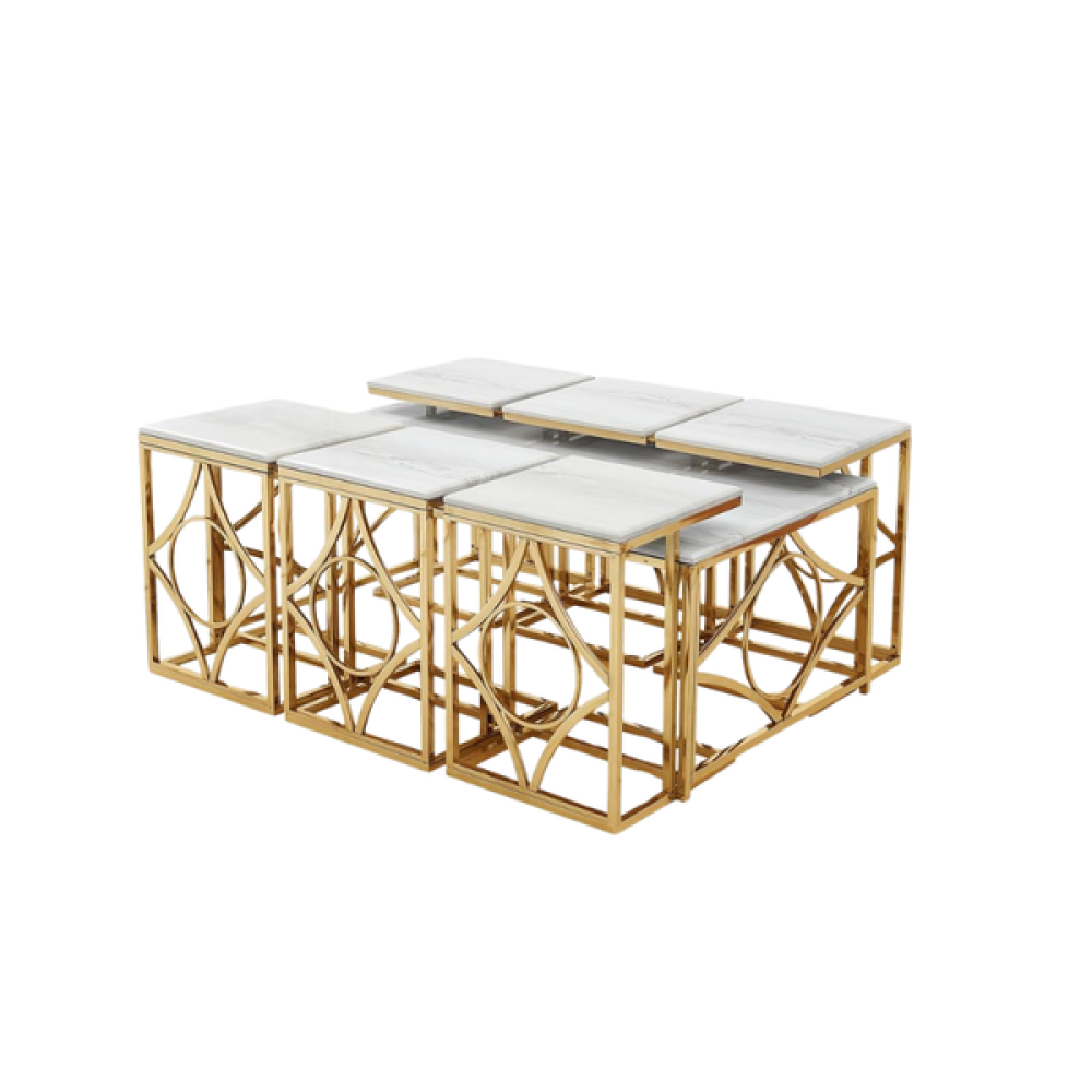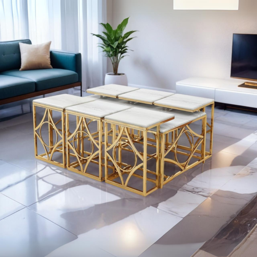 ارتقِ بمظهر غرفة المعيشة مع طقم الطاولات الفاخر المكون من 7 قطع. يتميز بتصميم عصري أنيق وخامات عالية الجودة تجمع بين الرخام الطبيعي والإطار المعدني المطلي باللون الذهبي، مما يجعله إضافة رائعة لأي ديكور داخلي.