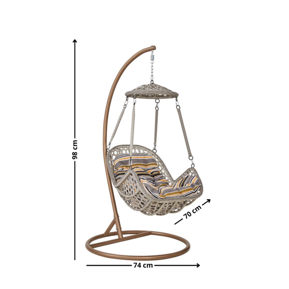 النوع : ارجوحة خارجية اللون: رمادى ارجوحة بمقعد واحد الخامة الاساسية : هيكل معدني مع تشطيب بخوص ( wicker ) خامة التنجيد : قماش فيبر خامة الارجل : معدن الابعاد : الطول : 74 سم العرض : 74 سم الارتفاع : 98 سم صفاته : مثالي للاستخدام الخارجي والداخلي يتطلب شحن تعليمات العناية :المسح بمناديل مبللة الضمان : ضد عيوب الشحن والتسليم بلد المنشأ : الصين