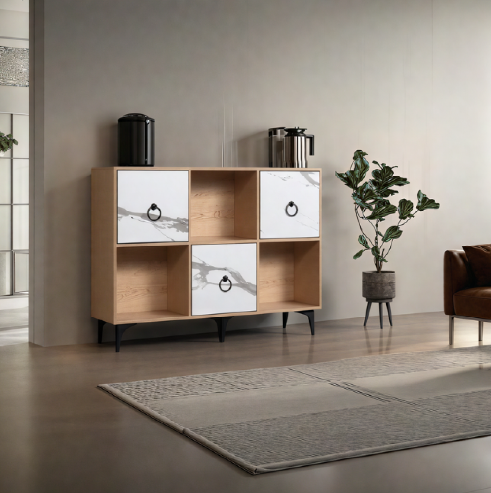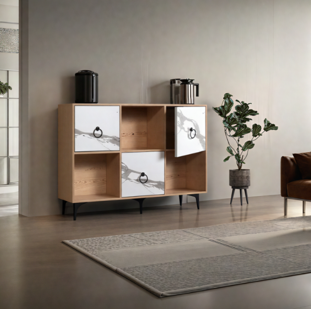 يتميز هذا البوفيه بتصميم حديث وأنيق، يجمع بين الخشب البيج والرخام الأبيض، مما يخلق مجموعة ساحرة وجذابة.